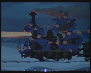 Toad manages to get to the train station and steal a train, and the police follow after him, shooting wildly.