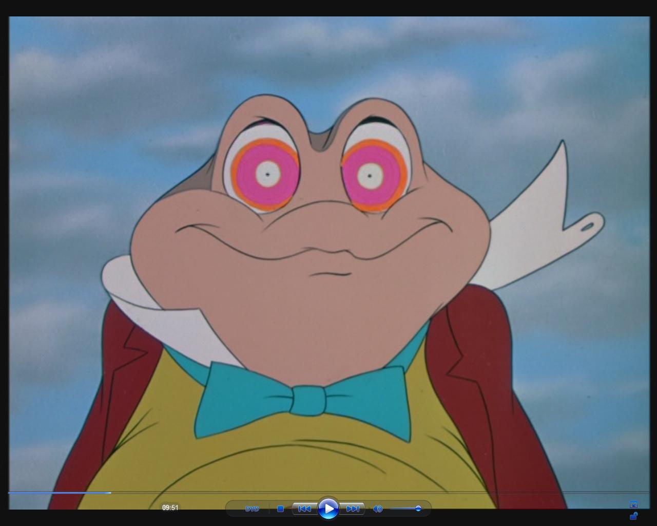 4. You know, I think I might have an inkling of what happened in between Toad drowning and Toad reuniting with his “friends”. I rode on Mr. Toad’s Wild Ride once in Disneyland, and I faintly recall that the final scene of the ride, right after the police chase, was in Hell with the Devil himself judging us. I think that there was supposed to be a scene where Toad ends up in Hell and has to confront his ill deeds that have led him here. He probably begs for one last chance and gets sent back. Only then they cut it from the movie and we’re left wondering what happen.