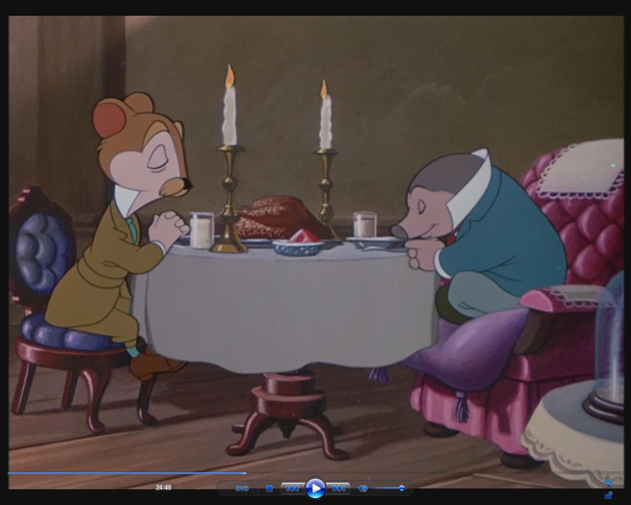 Toad jumps into the lake and, because he’s wearing a leg iron, sinks to the bottom. As he desperately struggles to reach the surface, we pan away to Mole and Rat praying over Christmas dinner.