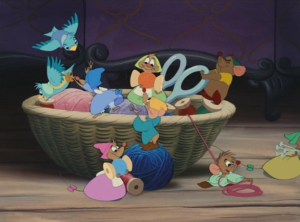 Plus, I can’t help but think what could have been when I hear the songs that didn’t make the cut. (They’re extras on the DVD; two of them are shown with their concept art.) “The Work Song” had an entirely different melody and words; it was sung by Cinderella, alternating between her daydreams of the ball and her wishes that there were more copies of her to do all the work (punctuated by her stepmother’s and stepsisters’ calls).