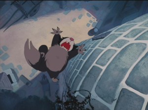 Lady Tremaine locks Cinderella in her room to prevent her from trying on the slipper, but she has not reckoned with the power of the Queen of Mice! The Duke arrives and Drusilla and Anastasia try desperately to force the glass slipper unto their massive, inhuman hind feet while Jacques and Gus manage to pickpocket the key from Lady Tremaine and drag it up to the tower where Cinderella is trapped. But Lucifer is guarding the door, and fights off all the mice like a goddamn boss. So they call in reinforcements from Cinderella’s dog Bruno, who chases Lucifer out the window where he falls to the ground below.