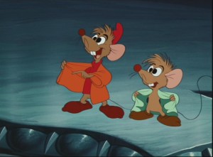 We’re introduced to the mice when the two above, Jacques and…friend, come to Cinderella to tell her that there’s a new mouse trapped in a mouse trap.