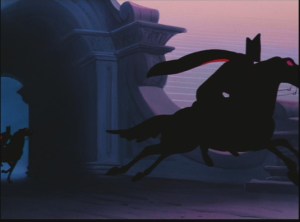Cinderella and the Prince sing So this is Love, and, I’m sorry, no it isn’t. You met five minutes ago. You should be singing, at most, I Just Met you (And this is Crazy). She doesn’t know he’s the Prince and is just about to kiss him when the clock strikes twelve and she has to hightail it out of there. Now, this is where it gets creepy. While trying to stop her from leaving, the Duke orders the castle gates to be shut, and when Cinderella’s coach gets through he sends the palace’s freaking army of Dark Riders after her.