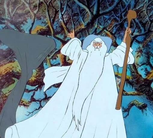 17 years pass and Gandalf comes back the shire and asks Frodo to hand over the ring so that he can examine it. He then throws it in the fire which reveals lettering written in the black speech of Mordor. In Peter Jackson’s movie Gandalf of course refused to speak the black speech in the shire. Bakshi’s Gandalf, however, does not believe in trigger warnings and loudly proclaims “Ash nazg durbatulûk, ash nazg gimbatul, ash nazg thrakatulûk agh burzum-ishi krimpatul.” which, according to my English/Black Speech phrasebook means “Could you please direct me to the nearest train station?”