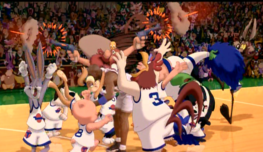 The Tunes reason that the Nerdlucks are small, slow and unathletic and that therefore the best way to beat them is to strap a couple of tonnes of Acme TNT to them and go out for ribs challenge them to a basketball game. The Nerdlucks agree, but when they realise they’ve agreed to a game they can’t possibly win they decide to cheat by stealing the skills of five NBA all stars.