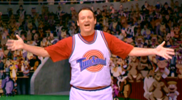 We cut to a golf course where Michael is playing a game with Bill Murray. Oh God. Poor Bill. He was so cut up about missing out on Who Framed Roger Rabbit that he must have just jumped at this without even realising that it was burning garbage. The dialogue in this movie alternates between hacky and unfunny (the Looney Tunes scenes) and the stuff in the real world which has the rambling, repetitious half-improvised feel of porno movie dialogue. The only one of the live action actors who comes close to making it work is Bill Murray, who, let’s be honest, is probably just making his lines up on the fly. Bill asks Michael if he has a shot of getting in to the NBA now that Barkley, Jonson, Bogues, Ewing and the dread Adam of Doctor Frankenstein’s dark labors can’t play anymore. Michael shuts him down with the spectacularly dickish line “No. It’s a man’s game. And you can’t play.”