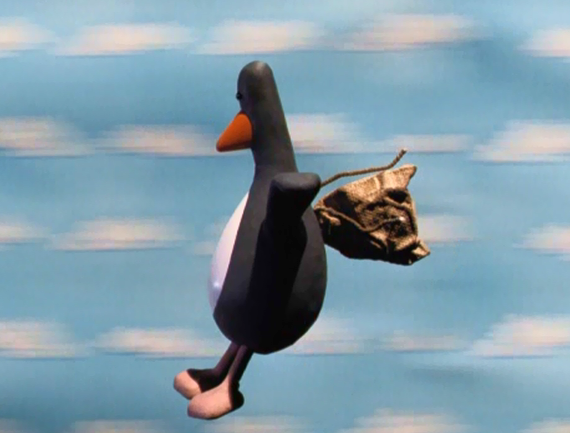 Which….would actually make perfect sense. Never mind. Anyway, Gromit packs a bindle and leaves in the dead of night, stopping only to gaze back at the house one last time before heading into the stormy night. This is quite possibly the first time a rain effect was ever achieved in a stop motion film (apparently they got the effect by putting tiny blobs of glycerin on a pane of glass and then blowing them frame after frame) and it looks perfect. And from the window, the Penguin watches menacingly and then gets to work on the Techno Trousers.