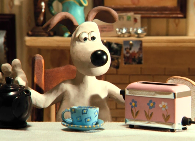 The movie begins with Gromit sitting at the kitchen table eating breakfast on his birthday. Gromit is an amazingly designed character. Because he doesn’t speak (or even have a mouth), all his emoting has to come from his eyebrows, kinda like Roger Moore.