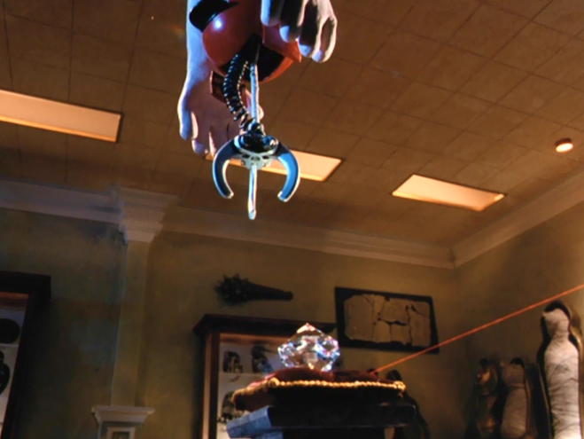 So the Penguin remotely guides the Techno Trousers into the museum by walking on the ceiling until he’s directly over the diamond. He then presses a button on the remote control which causes a hatch to open on Wallace’s helmet and out drops The Claw.