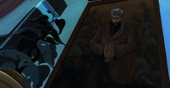 Francis looks in the direction that Bluebeard is staring and, oh look at that, there’s a murdered cat in his back garden. Bluebeard and Francis investigate the body and Bluebeard says that it must have been “a can-opener”, which, let’s face it, is probably what cats call human beings in real life so I’ll give the movie points for accuracy on that one. Bluebeard says this is the fourth body that’s turned up in a month, but Francis says he doesn’t think a human did it as the throat was shredded, not slashed. Francis decides to explore the neighbourhood and see if he can get some answers. Now, in case you’re wondering what my issue is with this movie, we’ll get to it. But I have to admit the film opens pretty strong. The atmosphere is nice and ominous, the animation so far is damn good and the mystery is unfolding in an intriguing way. It’s a little hard to pinpoint just when the movie goes off the rails but we’re not there yet. Francis notices that there’s a square space on the wall outside his new house and deduces that it might have been a doctor’s nameplate and reasons that that might explain the weird chemical smell in the house. Francis goes inside where Gus is talking to his friend Archie who’s trying to convince him to install parquet flooring. The movie the spends gets around three explaining that Archie is Gus’ only friend and that he’s a former hippie turned middle class yuppie which is all well and good but we will never see this character again and he plays absolutely no role in the plot. Nothing. And I wouldn’t have such a a big problem with that but…well, you’ll see. Francis turns in for the night and Gus comes in and puts on his “favourite music” to help him sleep.