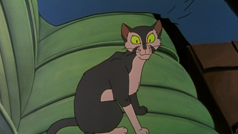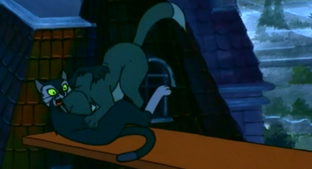 The house is basically a cross between the Addam’s Family mansion and a crack den, and Francis gets a bad stink off the place as soon as he sets foot inside. The smell seems to be coming from the top-most room. He hears a cat mewing and goes out to the back garden to investigate and meets another cat, called Bluebeard. Bluebeard is missing one eye and has heavy facial scarring, but the character design in this movie is so screwy that it looks  more like he’s wearing makeup like an eighties WWF wrestler.