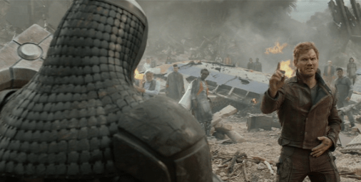 The Aster crashlands and Ronan staggers from the wreckage and yells at the terrified Xandarians like a drunk uncle at a wedding, telling them that the end has come. He’s just about to bring the orb down and destroy everything when he suddenly sees Peter challenging him to dance off.