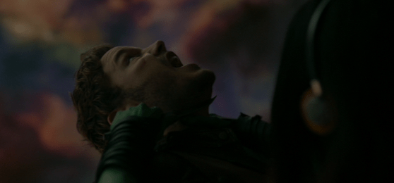 And I will admit, while I’m not really a fan of Pace’s performance as Ronan, his bemused and slightly scared “What are you doing?” is just glorious here. What Peter is doing, of course, is distracting Ronan so that Drax and Rocket can shoot the orb out of his weapon which Peter then catches. Holding the orb with your bare hands, attentive readers will recall, is ill advised at best and Peter instantly starts going to pieces.