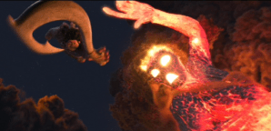 After sneaking into Tamatoa’s cave, Moana distracts the crab by getting him to sing about himself so that Maui can get his hook back. The song, Shiny, is my favourite song in the whole movie (minority opinion, I know). But of course, Tamatoa only gets five minutes of screentime or so and is not even our main bad guy. Lindsay Ellis did a great video recently on how the traditional Disney villain is going extinct and it’s a damn shame because we deserve a better class of criminal. That’s not to say that Tamatoa is a bad villain, actually the opposite. I think he’s great, we just needed more of him. If it was up to me, I’d have Tamatoa remain a presence in the story all the way through, maybe have the Kakamora be his henchmen and have him follow Moana and Maui all the way to the final battle with Te Kā. Just as Te Kā is a dark opposite of Moana, (a fire demon who doesn’t know who she is), Tamatoa is Maui if he let his selfishness and vanity and superficiality completely overcome the better part of his nature. So you’d make the final battle two on two, Maui against Tamatoa and Moana against Te Kā.  Well anyway, we gots what we gots. Maui gets his hook back but finds that his shape shifting powers don’t work anymore and Tamatoa beats him and nearly eats him…