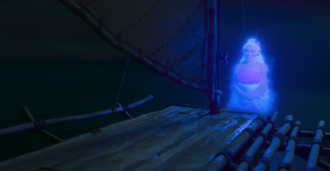 Tala shows Moana a secret cave where a fleet of sailing boats are hidden along with a massive tapestry depicting the voyages of the ancient islanders. This leads us into We Know the Way, a brilliant song that basically works as a two minute short film depicting generations of Polynesian explorers traversing the Pacific. Moana realises that her ancestors were voyagers who settled the island instead of hatching from coconuts like she’d always been told. Moana asks Tala why they stopped and she explains that after Maoi stole the Heart of Te Fiti, the ocean got more and more dangerous and the boats stopped coming back. So the islanders stopped sailing, hid their boats and basically stuck fingers in their ears and went “Lalaalala everything’s fine” while outside the world got steadily more Pirates of Dark Water.