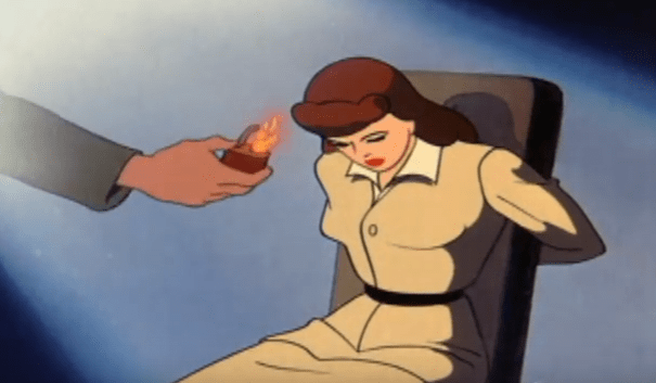 So the Germans have taken over a remote tropical island and have taken control of the local tribe who worship them as gods…look it’s a cartoon from the forties with word “Jungle” in the title, you knew there was going to be racism, don’t even front. Anyway, they shoot down an American plane that just happens to have intrepid gal reporter Lois Lane on board. Before the pilot dies, he gives Lois some plans showing the route of an American convoy but she gets captured by the tribesmen before she can destroy them. She manages to briefly escape and hide them in the jungle but is recaptured. She’s brought before the German commander who tells her that unless she tells him where she hid the plans he will straight up burn her alive. Lois’ response?