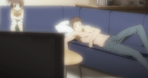 Episode 1 begins with Kyon sitting on his coach one morning watching baseball on TV.