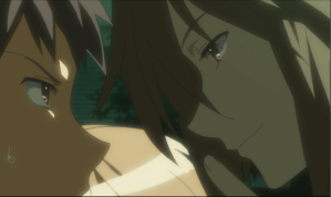 Kyon assumes that the timeloop was caused by Mikuru because she’s a time traveler (that is profiling, dude) but Itsuki says that it’s Haruhi who’s to blame, and that she must subconsciously want summer to last forever. Also, if you’re a fan of “Itsuki looking like he’s about to take Kyon roughly like a longshoreman” I would definitely recommend Episode 2.
