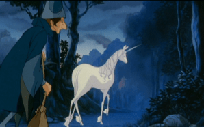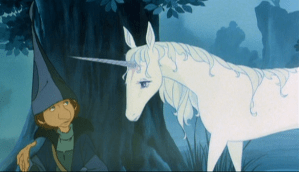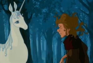 1. I too did not see this movie until adulthood. However, I watched it after I took a sci-fi and fantasy literature class wherein we read and parsed and dissected “The Last Unicorn” almost to death. I say “almost” because all that analysis couldn’t kill the quirky charm of the novel. (Captain Cully inviting Schmendrick to “sit down, have a taco” kills me every time. As does the butterfly calling the unicorn a fish monger.) And you’re absolutely right, one of the main themes of the book is reality vs fantasy.