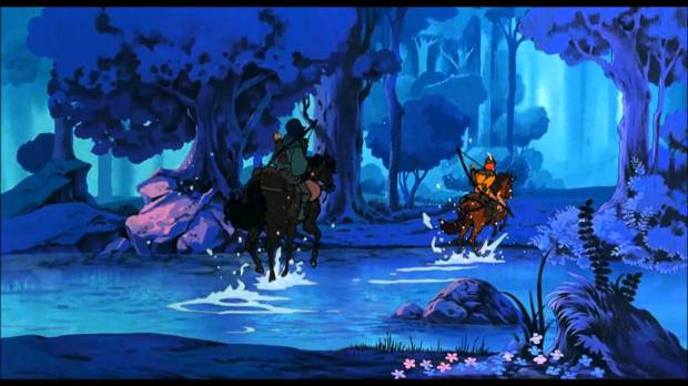 So I suppose it’s time for me to come clean and admit that I’m not a big fan of the animation. The human characters are done in the same ridiculously detailed, border-line grotesque style as Rankin Bass’ The Hobbit. Many love that style. That’s fine. That’s their right. And we’ll have no problems as long as they stay on their side of town. But it’s next to impossible to get figures that detailed to move with any kind of fluidity and the animation of the human characters is quite janky. The unicorn is a much more elegant design and moves much more gracefully, but she’s drawn so differently to the other characters that it’s kind of jarring. Again, it kinda fits thematically, I guess, but I just can’t say I like it. I will say this though, this movie is a heck of a lot prettier when it’s standing still. The backgrounds in particular are just breathtaking.