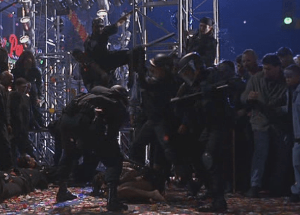 They go to the Millenium party where Strickland, Philo and Faith are all in attendance. Funny story, this final scene has thousands of extras which the film-makers got by actually throwing a real rave and booking acts like Aphex Twin and Dee Lite. The party lasted from 9 pm to four in the morning and several people were hospitalised after taking ecstasy because this movie is the most nineties movies that has ever nineties movied. Lenny points Strickland out to Mace and she follows him into the men’s room and tells him he needs to go into one of the stalls and watch the SQUID clip. And he has her escorted from the building. Which might seem harsh, but remember that SQUID is illegal contraband so she basically just went up to the chief of police and said “Sir, you need to go into that stall and do this heroin right now.” I mean, I don’t wanna manwhitesplain, Mace, but if the clip shows evidence of his officers engaging in illegal activity, maybe open with that rather than keeping everything spoiler-free.