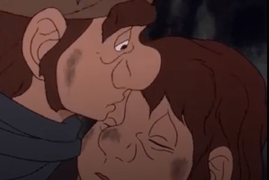 Anyway, let’s talk about the animation. It’s good enuff. I didn’t really care for Rankin Bass’ style in The Last Unicorn but here it’s applied more consistently and it does the job. How successfully different elements of LOTR are translated visually varies wildly though. They mostly get the places right. Minas Tirith and Mordor all look perfectly acceptable. And I’m mostly down with Gandalf and the Hobbits, although after BLOTR the movie could scarcely do worse by poor Samwise.