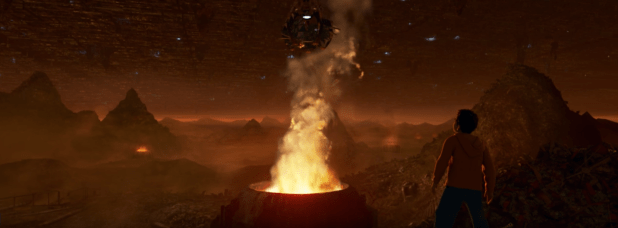 Okay: the good news. The scene is finally brought to a merciful end when a flying robot scoops him up and brings him a mysterious shack hanging from the underside of the planet’s surface. The bad news is: we’re now deep in Gribble territory.