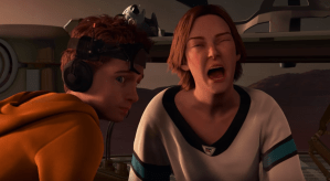 The Supervisor is captured and she reveals that she orchestrated this whole robot-childcare based society because the females didn’t have time for raising children and the males were too busy dancing and having fun which is why they have to be exiled to the garbage world below the surface and Jesus Christ it’s like somebody bought the rights to some red-pilled reddit forum bullshit and stuck Scrotum aliens in it.