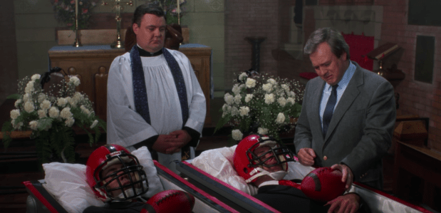 So, you know how nowadays it’s fun to look back at movies like 16 Candles or Breakfast Club or…um…Molly Ringwald’s entire filmography and going “Wow. Pretty much every character in these things is a complete monster”? Heathers is stunningly ahead of the curve on that. A dark running joke is that every one of the popular kids who commits “suicide” becomes canonised as a beautiful, troubled soul with depths no one ever knew about while Veronica and Jason (and we the audience) know that they were just awful, stupid, horrible, racist, homophobic nightmare-people. After killing the two comically awful football jocks and staging their deaths as a gay suicide pact Jason snarls that they “had nothing to offer the school except date rapes and AIDS jokes”. And yes, even as it condemns the homophobia of the eighties, there are definitely jokes and lines of dialogue that have not aged well but, godammit that funeral scene.
