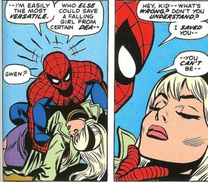 Frantically, Peter shoots his webs to catch her before she hits the ground…and he does! He’s saved her! He’s won! Good triumphs over…