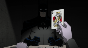 Batman visits the Joker in Arkham Asylum and get the iconic scene of Batman trying to reason with the Joker while he just sits there silently playing solitaire.