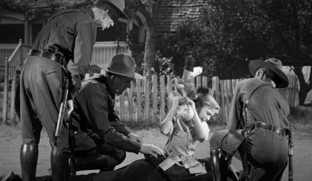 Meanwhile, in their garden, little John Harper (Billy Chapin) and his younger sister Pearl (Sally Jane Bruce) are playing when their father Ben suddenly arrives home in a mad panic and covered in blood. He hides a wad of bills in Pearl’s doll and swears the children to secrecy. Suddenly the police arrive and handcuff him on the ground while the children watch in horror.