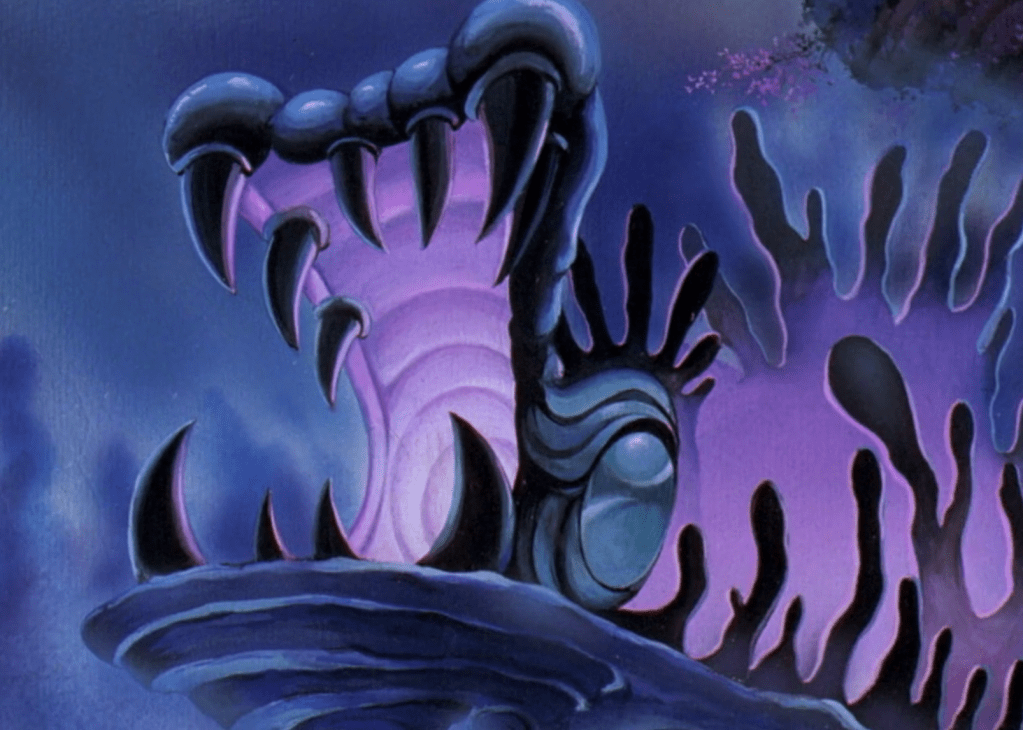 Here’s the amazing thing. Not only does this episode re-introduce Ursula, one of the absolute GOATs of the Disney Villain Pantheon. Not only do they have Pat Carroll back voicing the character. But they don’t fuck it up. I’m serious. This deeply mediocre little cartoon actually manages to do Ursula justice. Now, a lot of that is on Carroll. They give her a song when she appears, You Wouldn’t Want to Mess With Me. Now, the song is better than most of the songs this show had simply by dint of being a villain song and therefore not dripping in treacle. But it is certainly not, objectively, a good song. But Carroll sells the hell out of it. She fills every syllable with such husky, voluptuous relish that she makes it listenable through sheer force of personality. Now, Ursula’s spells keep going wrong and she assumes that since it obviously can’t be because she’s doing something wrong, there must be another reason. And when she sees the Bad Luck creature she decides to choke a bitch.