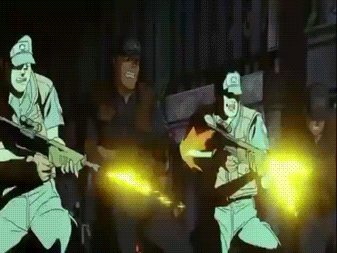 Meanwhile, the celebrations are being watched by two new arrivals to the city: Sunsako, a detective from Tokyo, and his nephew Kenichi. To their horror, they see a robot protestor being gunned down by one of the Marduks, an anti-robot paramilitary group. Now, if you felt a slight twinge of familiarity then you may be thinking of another very well known animé that has security forces gunning down a political dissident before a shocked crowd.