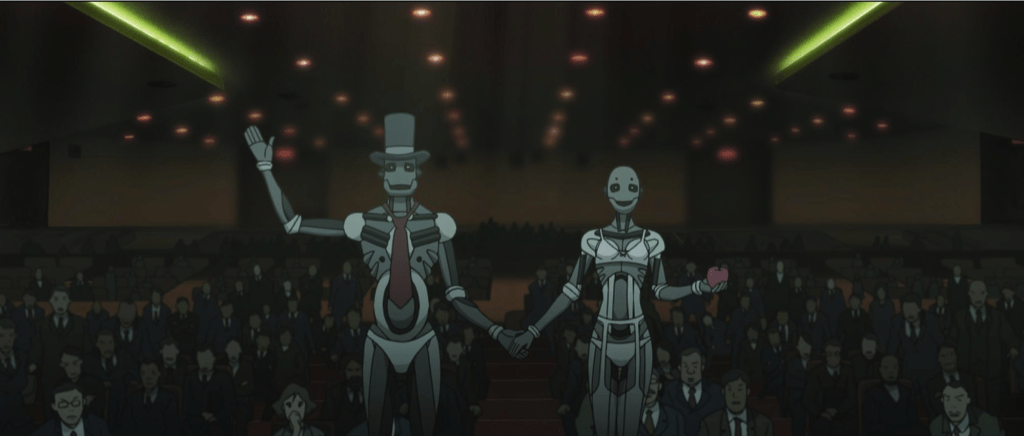 Secondly, the animation is done in this faux-trad/CGI style that I just can’t get behind. It just looks plasticky and cheap to me. It’s certainly not terrible but it’s a conspicuosly weak entry for an anthology with such an incredibly high standard in its visuals and animation. Then there’s the story. Matriculated is by far the longest of any of the shorts at a quarter of an hour and it doesn’t really spent its time well. Instead of fleshing out these characters whose deaths we will soon be mourning, the bulk of the short is given over to surreal imagery in the mini-Matrix as the Machine learns what it is to be hoo-man. I’m not exactly sure what the message is either. The humans state that they don’t want to simply re-program the machine and that they want it to discover the joys of free will and join them voluntarily. They reason that since the Machine is enslaved to its programming, it will want to choose to be free. But of course, the humans aren’t going to let the Machine choose to continue trying to kill them. The Machine is free to choose, as long as it makes what the humans consider the correct choice.