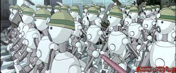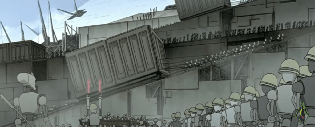 So we go from a short with almost no story, to one with enough story for an entire movie trilogy or even a series. Part 1 crams in a dizzying amount of history and lore into a scant nine minutes. The use of real world atrocities as a visual shorthand is definitely dubious and borderline manipulative, but it’s hard to deny the power of these images, aided immensely by the superlative score and sound design and Mahiro Maeda’s brilliantly detailed animation. Some of the images are spectacular, some appallingly gruesome, but there is not a single one that is dull. Part 1 reinforces the Matrix’s themes of cyclical history, whether it’s the reference to 20th century atrocities or the image of robot workers hauling massive concrete blocks to build pyramids for their human pharaohs.