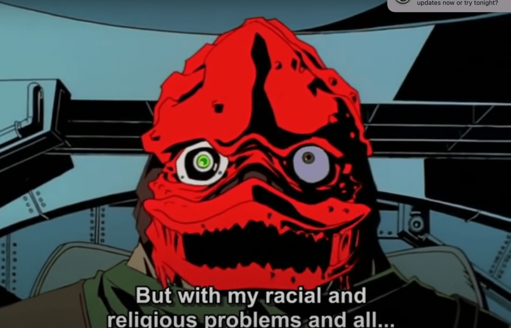 JP heads to EUЯPSS, which is the moon over Roboworld which has been turned into a demilitarised zone as part of Roboworld’s treaty with the M3 Nebula Federation. This movie actually reminds me quite a bit of Buckaroo Banzai in that it keeps referencing deep lore that…doesn’t actually exist. There’s obviously a ton of history and galactic geo-politics that have been worked out for this world but if you want to learn about it, you get to pound sand, my friend. There is no expanded Redline universe. There is no manga, no TV animé, no computer games (FOR SOME FUCKING REASON WHAT IS THE MATTER WITH YOU GAMES INDUSTRY?!). This movie is literally the only piece of media set in this universe. Well no, I tell a lie. There is also a series of shorts called Trava: Fist Planet that features two characters who also appear in Redline which I found out about literally hours before this post was due to go up.