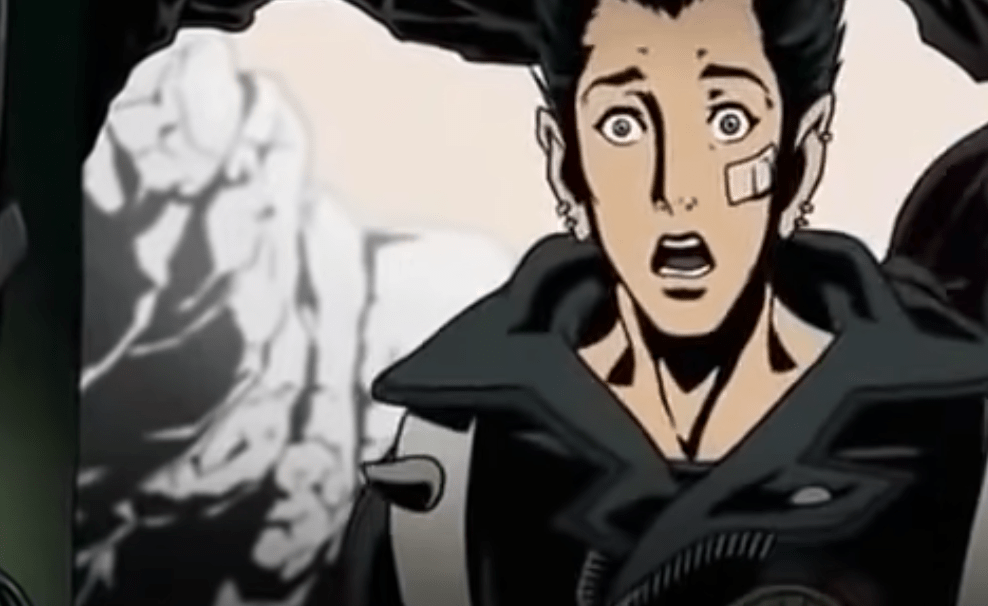 Actually, looking through the screencaps there’s something vaguely familiar about it. Maybe it’s the fact that the character have somewhat JoJo-styled facial features. Maybe it’s the coloration reminding me of The World Ends With You.