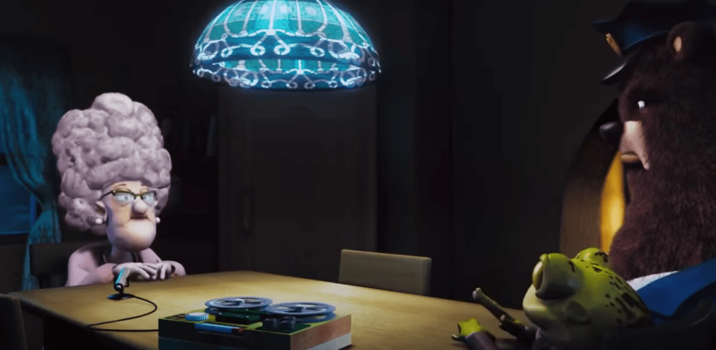 And the movie ends with Red, the wolf, Twitchy and Granny being recruited into Flippers’ detective agency.