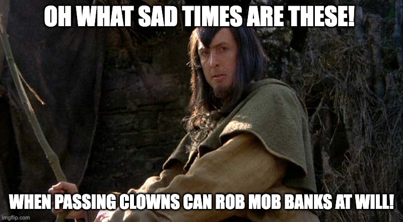 Anyway, the bank manager sees the last clown murder his two comrades and laments that criminals used to have respect and a code of honour.