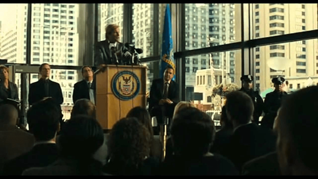 So at the commissioner’s funeral, a disguised Joker opens fire and seemingly kills Gordon. Dent, starting to break mentally, abducts one of the Joker’s henchmen and tries to psychologically torture him into giving the Joker up. Batman arrives and tells him that he can’t let the Joker bring him down to his level and tells him instead to call a press conference where Batman will reveal his secret identity.
