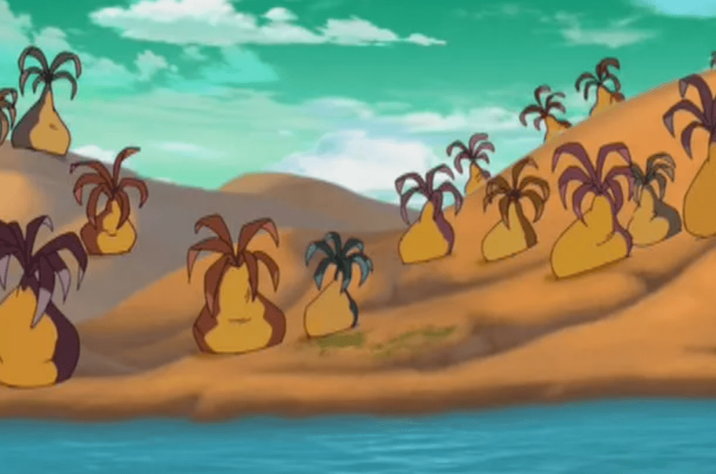 Yes, it turns out that the Yellowbellies hide from predators by sticking their heads in the ground and disguising themselves as plants. Cera begs to be released from this living death and go home but Littlefoot insists that it’s too late and they’ll have to spend the night with hundreds of Yellowbellies and for some reason the others don’t hold his flat head under the water until the last bubble goes “bloop”.