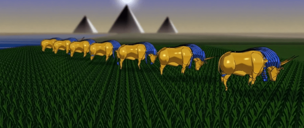 So, let’s talk about the dream sequences because they’re probably what the movie is best known for. They’re honestly a mixed bag. Some of them, like the Van Gogh inspired sequence where Joseph predicts the wolves attacking the flock is absolutely gorgeous. Some of them though, like these two of Pharaoh’s predicting the seven fat years and seven lean years are done in CGI and…