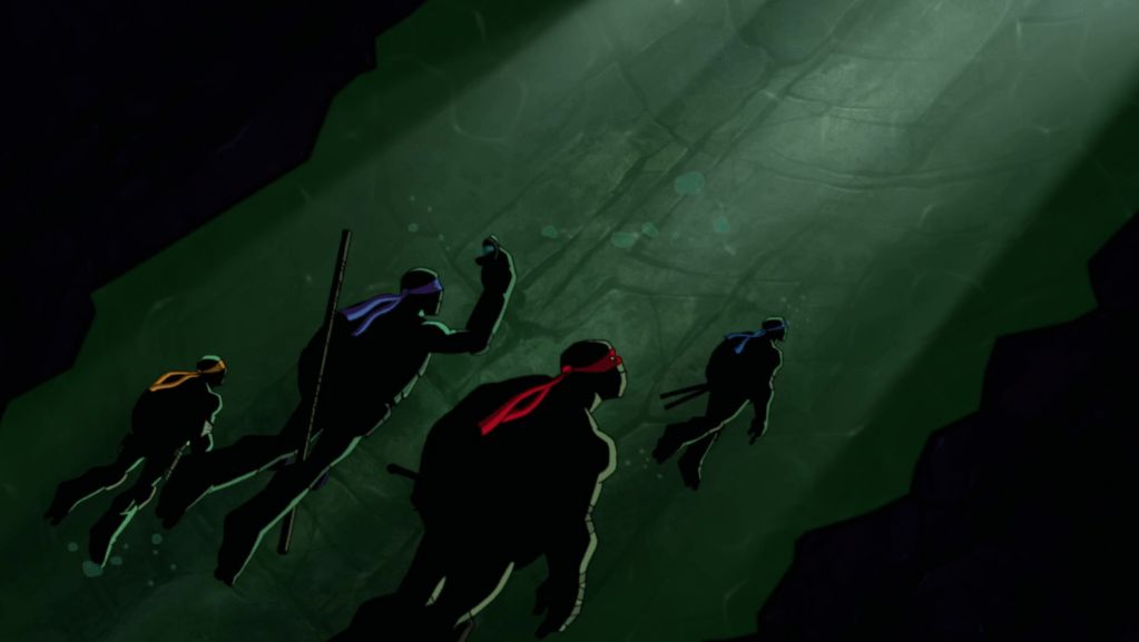 Meanwhile, Donatello researches Batman and is able to actually pinpoint the Batcave’s location, which the turtles reach by swimming through the sewers in a shot that is just casually gorgeous.