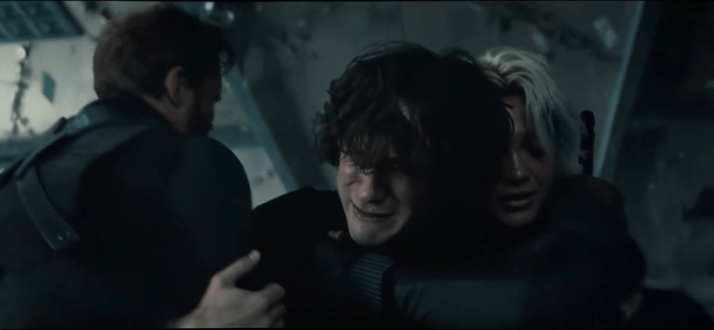 Down on ground level Yelena angrily leaves the others behind but Alexi chases after her. She breaks down and angrily chews him out for not reaching out to her after Natasha’s death. He apologises, she tells him how shit her life is going and that she hates who she’s become. He comforts her, and they have a really nice reconciliation (that Florence Pugh is going places, I tell ya what) and then they realise that there is a Vantablack man in a cape hovering over the city.