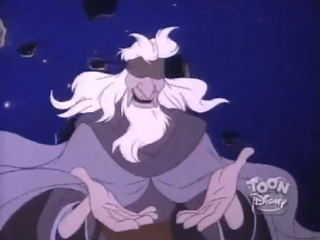 This episode begins with Mirage in her evil dimension known as Morbia (where it’s always Morbin’ time) arguing with Fasir, another recurring character in the series. Fasir is basically a blind, mystically powered mysterious old person who’d show up randomly to give Aladdin a quest to go on. He’s Aladdin’s Madam Webb.