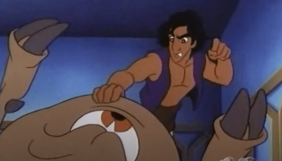 Aladdin discovers Mozenrath’s lab and learns that the Thirdac is from a dimension where magic is as plentiful as water and that the creature is basically dying of thirst but that Mozenrath plans on using it to conquer every magical realm out there. They find Genie and Aladdin sees what he thinks is Genie being eaten alive and proceeds to beat the absolute tar out of the Thirdac.