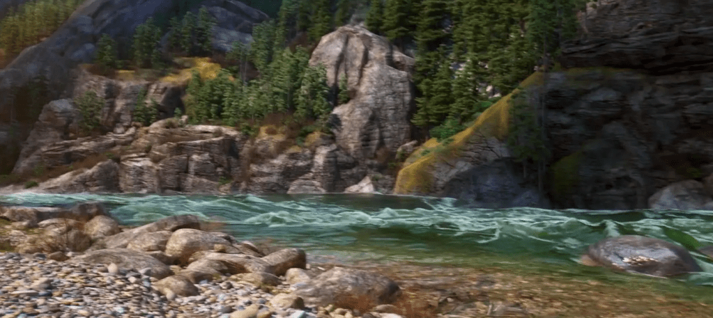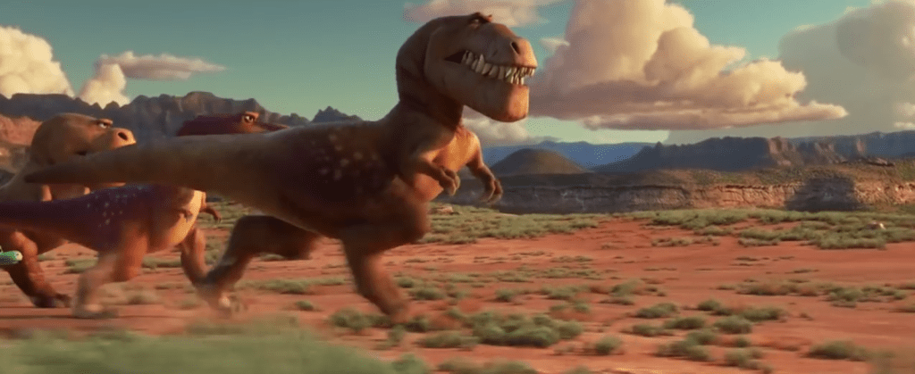 There is absolutely zero stylisation in the backgrounds, to the point where you wonder why they didn’t just shoot them on location and animate the characters in. And the problem with that is that when you have Arlo falling into a river and being swept away, it looks like a gas station’s inflatable dinosaur mascot came loose from its tethers. There is just no way you can reconcile characters that goofy looking existing in this world.