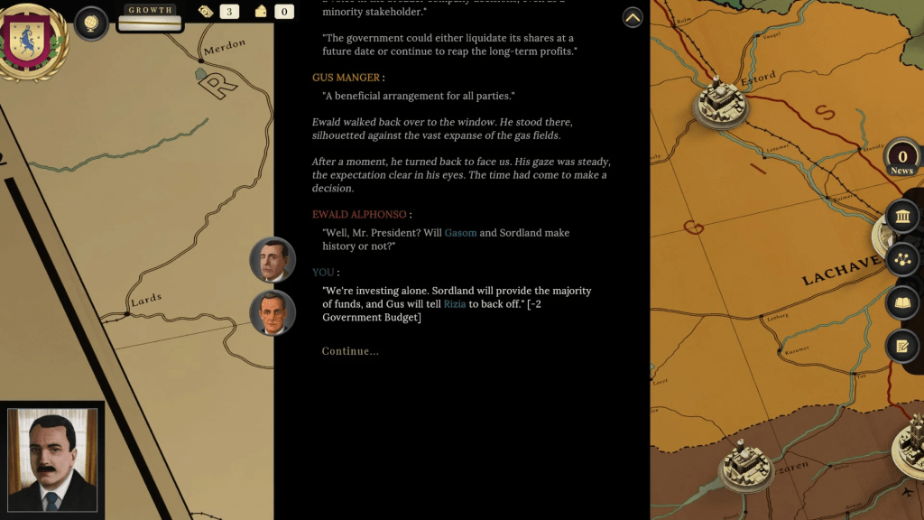 Suzerain is a 2020 political simulator from German publisher Torpor Games, available on Nintendo Switch, Mac, Android, iOS and Windows. You play Anton Rayne, the fourth president of the fictional nation of Sordland in the equally fictional continent of Merkopa. After a choose-your-own-way recounting of your early life which functions as a character creation session you get to choose Anton’s socio-economic and political background. The game takes you from his election to president to the end of his first term, with you facing various political crises and scandals while you try to shape the country to your own political ideology.
