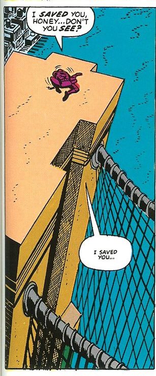 At this point in the comics, Peter Parker was no longer a teenager. He had graduated college, he was an adult. But he was still very much a children’s character. And I find something indescribably tragic about this child’s superhero cradling the body of the woman he loves, unable to comprehend that his world has changed and that the old rules don’t hold true anymore. Good does not always triumph over evil. The innocent are not always spared. The guilty are not always punished. The people you cannot live without will be taken nonetheless. It’s a story about the loss of innocence we all go through and it’s one of very few single issue comics that I would hold up as an absolute work of art. It’s a piece that’s moved me deeply and that I feel a real personal connection to. And I think one of the reasons why it is such a gut punch is because the brutal tragedy at the heart of story is contained in all this colourful, innocent Silver Age goofiness, like a hand grenade with a pink smiley face on it. It wouldn’t work a tenth as well if done in a moody, gritty “realistic” style.
